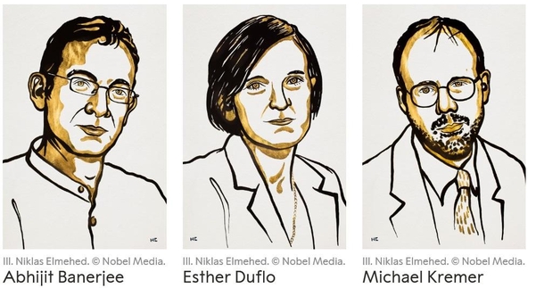 올해 노벨경제학상은 아비지트 배너지와 에스더 듀플로, 마이클 클레이머 등 미국 경제학자 3명이 공동수상했다.