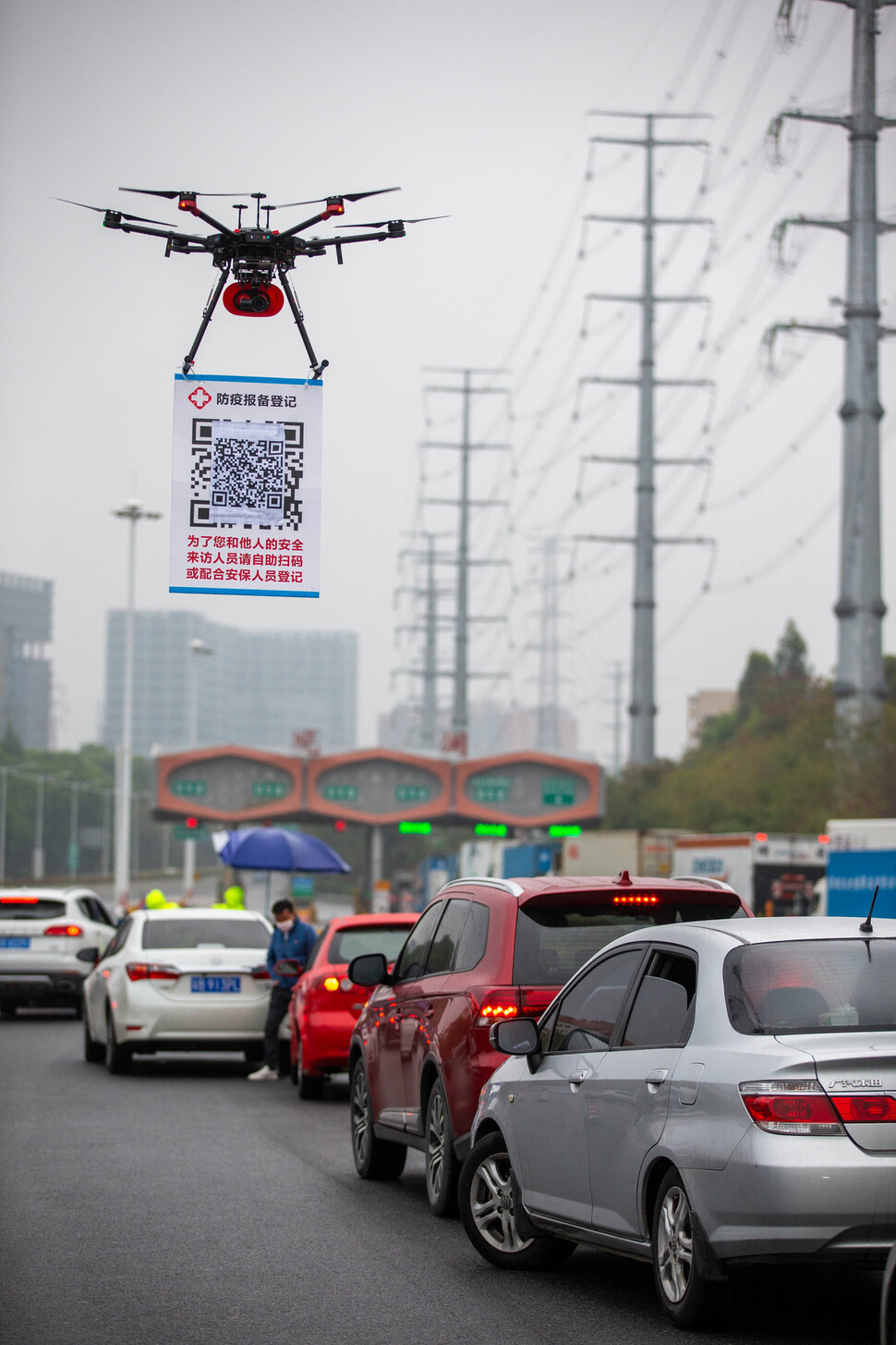 11일 중국 선전의 한 고속도로 톨게이트에서, 시내로 들어오는 차량들에 코로나19 관련 차량 정보 온라인 등록을 요구하는 정보무늬(QR코드)가 드론에 매달려 있다.